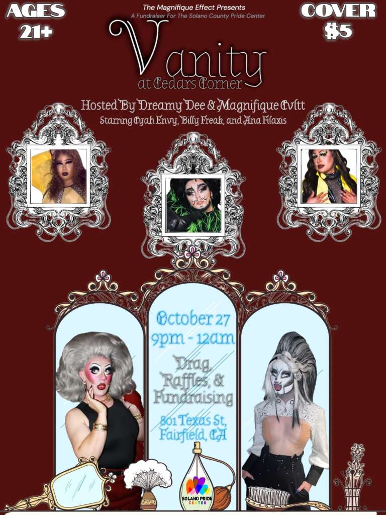 Dreamy Dee & Magnifique are hosting a first Drag Show called “Vanity!” They will be joined by Cyah Envy, Billy Freak, and Ana Filaxis. Drag, Raffles & Fundraising to benefit Solano Pride Center!