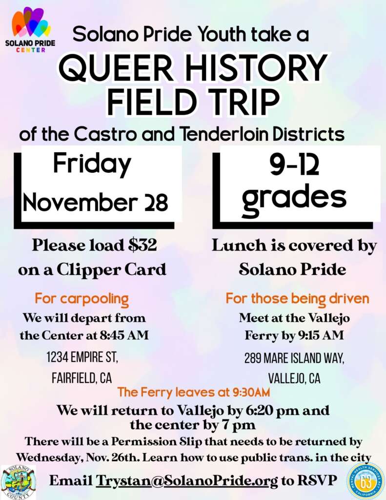 9-12th Grade Queer History Field Trip to the City, learning how to use public transit, from Ferry, BART & Muni! Download the Permission slip below, having it filled out and given to Trystan by Wednesday, November 26th at 9 am to trystan@solanopride.org!