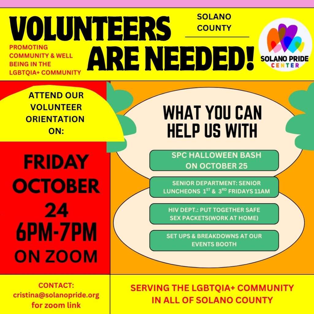 Calling all volunteers! If you want to be a volunteer at Solano Pride Center, please let us know!