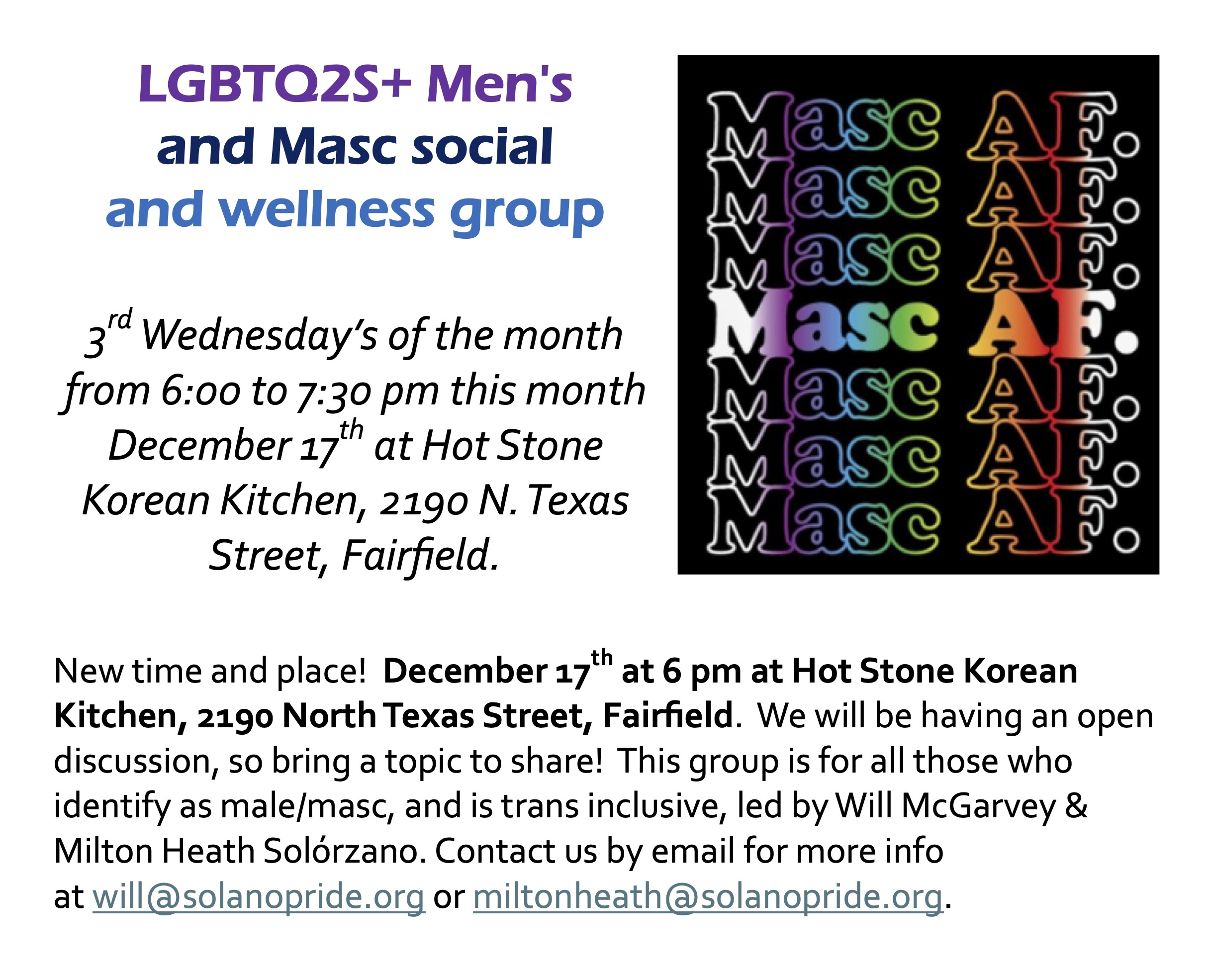 | LGBTQ2S+ Men’s & Masc Social & Support Group on the 3rd Wednesdays – New time and place! December 17th from 6:00 to 7:30 pm – we will meet at Hot Stone Korean Kitchen for dinner and conversation. Let Will or Milton know where you’d like to meet there. This group is for all those who identify as male/masc, and is trans inclusive, led by Will McGarvey & Milton Heath Solórzano. Contact us by email for more info at will@solanopride.org or miltonheath@solanopride.org. |