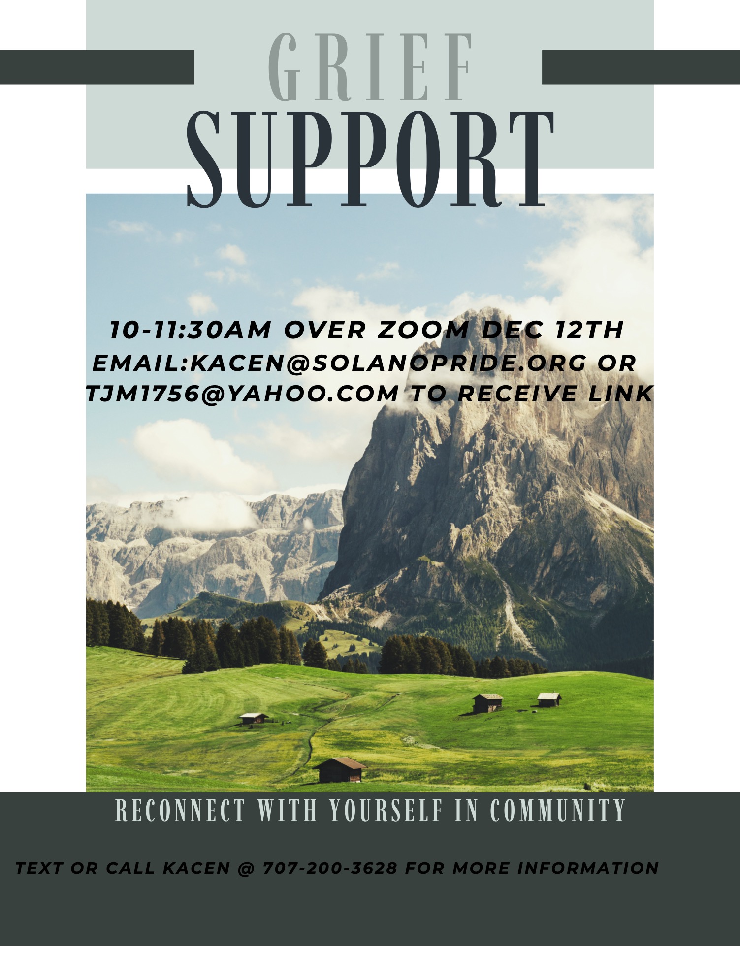 | Grief has no set boundaries. Grief comes in many different avenues such as losing a spouse, parents, a sibling, your pet, the loss of a friend or a friendship, even the loss of a job can cause us to grieve. This new group will begin Friday, December 12th from 1 – 11:30 am on zoom. The way in which we cope with the loss is the way in which we begin to heal and move forward with our lives no matter the depth of pain and sorrow we are in. One way and there are many depending on how one copes with the loss is to talk about what we are feeling, what we are going through and share those feelings and thoughts with others who may be experiencing the same just as you are. The grief counseling session is an avenue for people to continue their healing process. More info, including the zoom link, at Kacen@solanopride.org or Tim Meyers at tjm1756@yahoo.com. |