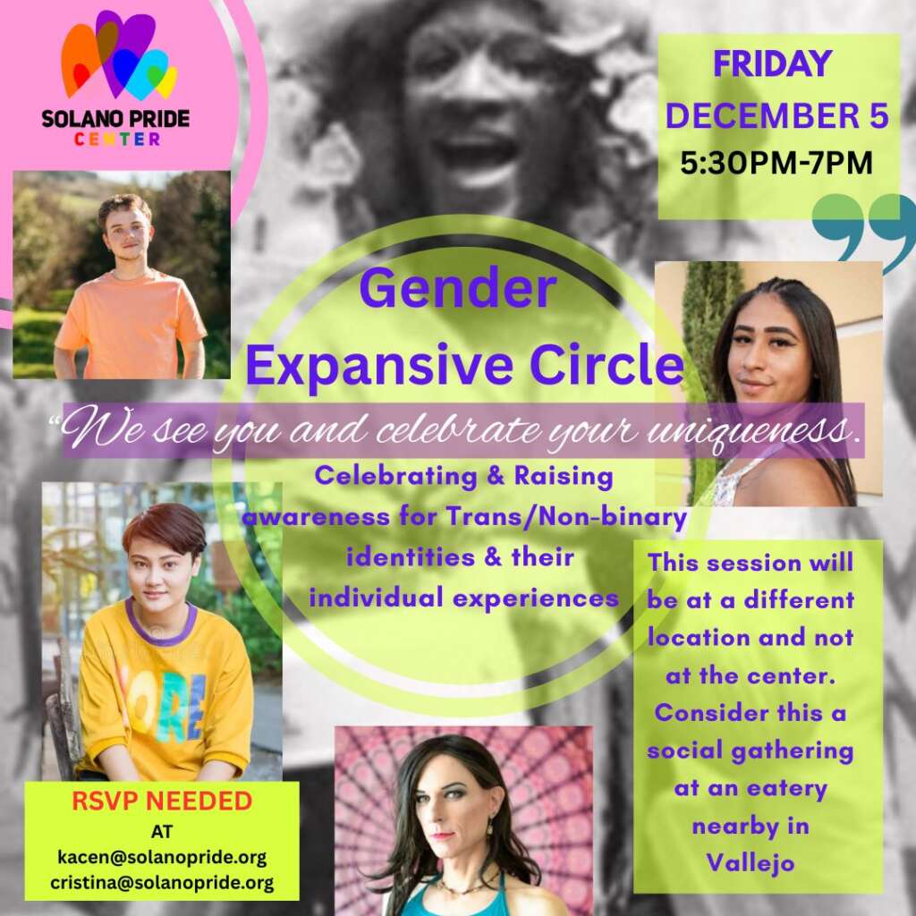 | The Gender Expansive Circle will meet again on Friday, Dec 5th at 5:30 pm at a restaurant in Vallejo for a Social Night. GEC meets on the first and third Friday’s of each month unless noted. FirstFridays in person in the Conference Room or Library Lounge & Third Fridays on zoom. Please enter through the side entrance. This group is for Trans, Intersex, Non-binary, Gender non-conforming and those questioning their gender identity or expression. The group will be led by Kacen Cosmos and Cristina Zaldana! Questions can be directed to Cristina Zaldana at cristina@solanopride.org. |