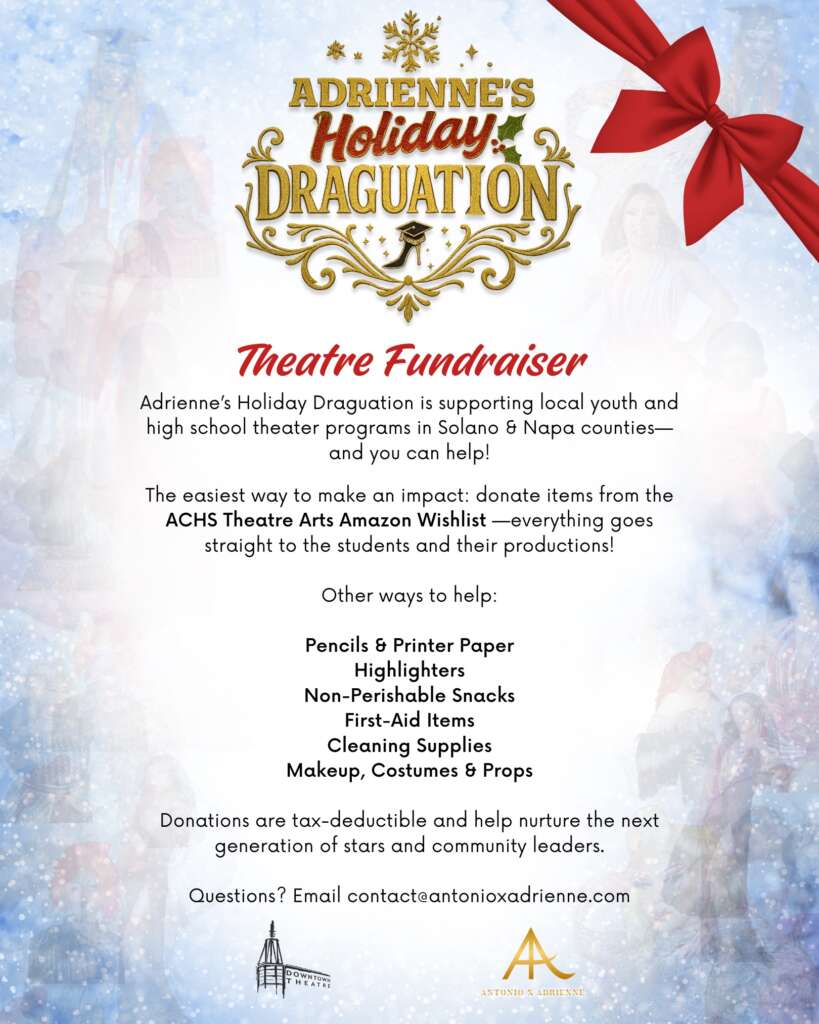 Adrienne’s Holiday Draguation—a festive and glamorous drag showcase—is coming to the Downtown Theatre in Fairfield, CA, on November 29th. Inspired by Adrienne LaCielo’s graduation from UC Irvine (Bachelor of Music, Business), the event rings in the Holiday season while celebrating LGBT+ artistry, theatre arts, and education. This unforgettable night brings together community and creativity, with proceeds benefiting local youth theatre arts programs and helping preserve vital cultural spaces, including the Downtown Theatre itself.