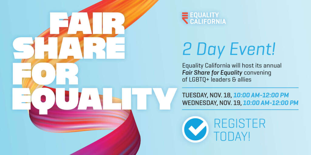 A quick reminder to register for Fair Share for Equality 2025 — Equality California’s annual gathering where LGBTQ+ community leaders, advocates, and policymakers come together to help shape our legislative priorities for the coming year.