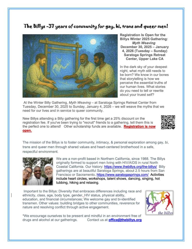 The mission of the Billys is to foster community, intimacy, & personal exploration among gay, bi, queer and gay-identified trans men through shared values and heart-centered brotherhood. We have weekly online heart circles, potlucks and several in-person gatherings each year. Participants come from all over California, the US and the world.