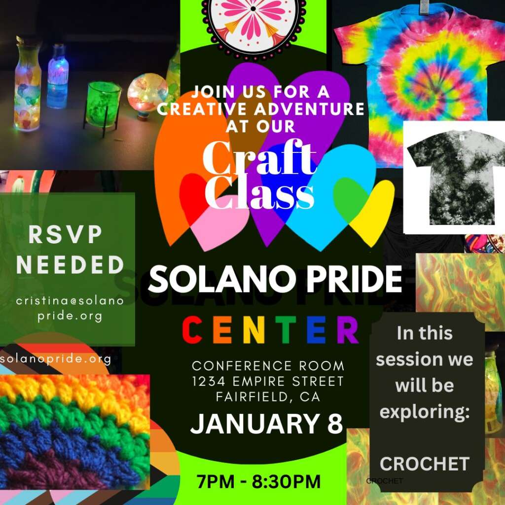 We are planning out some fun socials for the new year, including an Arts & Crafts Thursday night at 7 pm in the Conference Room! Wayne Goodman will be by to teach a new crochet style, and we are finalizing other projects if you’d like to offer one to cristina@solanopride.org.