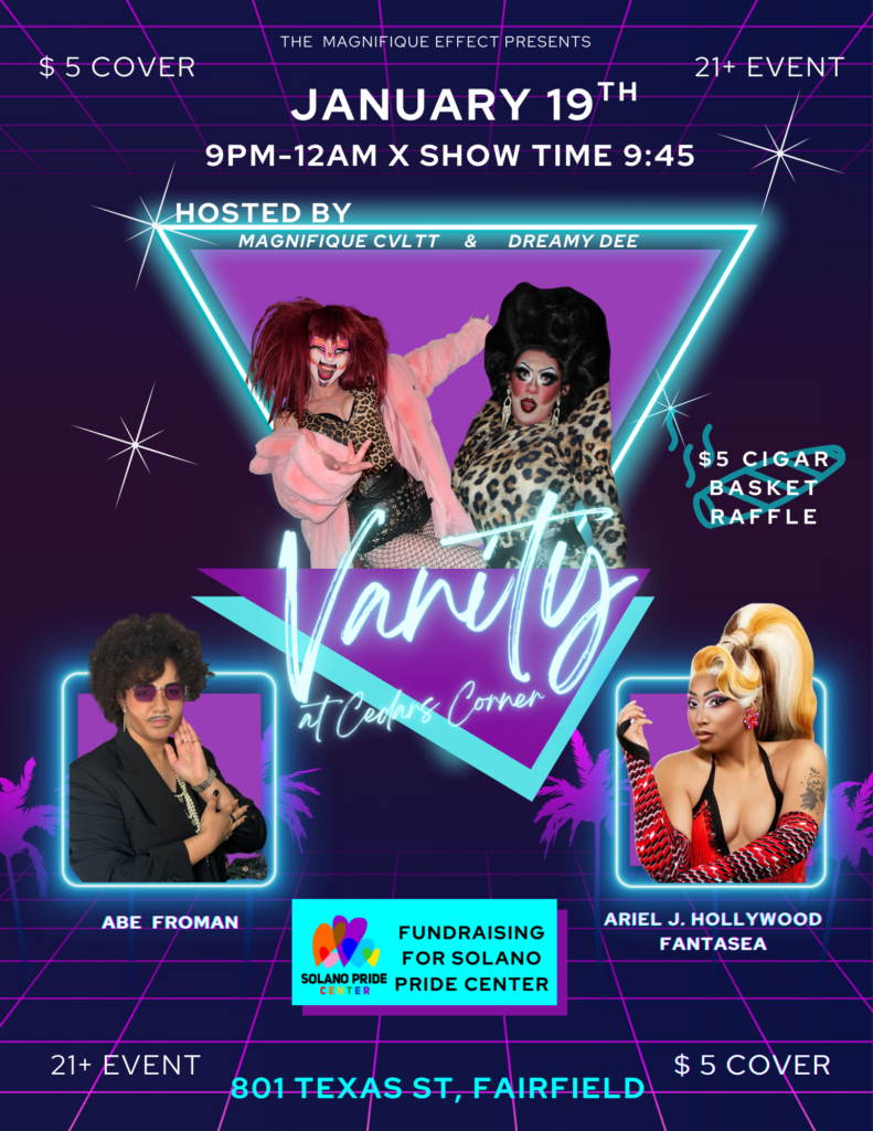 Come check out their great menu, and grab a late bite along with some amazing Drag by the Crew! We will have a raffle for to help raise funds for Solano Pride Center, this basket will be items from the cigar shop that is owned by the owner of Cedars! $3 of each ticket goes to Solano and $2 of each goes back to The Magnifique Effect to ensure the continuation of events!