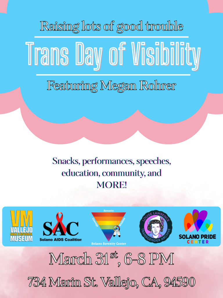Our yearly program with Solano Serenity Center will feature Megan Rohrer, author of Transgender San Francisco, among others sharing and expanding the visibility of the Trans Community!