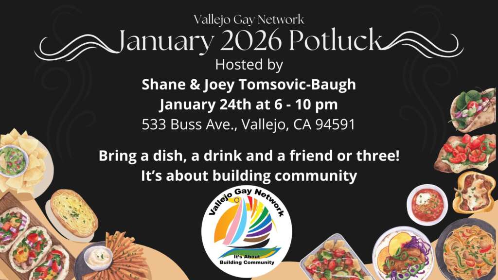 As usual, bring a favorite dish to share, a drink to wash it down with and a friend or three. We’re all about growing our LGBTQ+ community in Vallejo and Solano County.