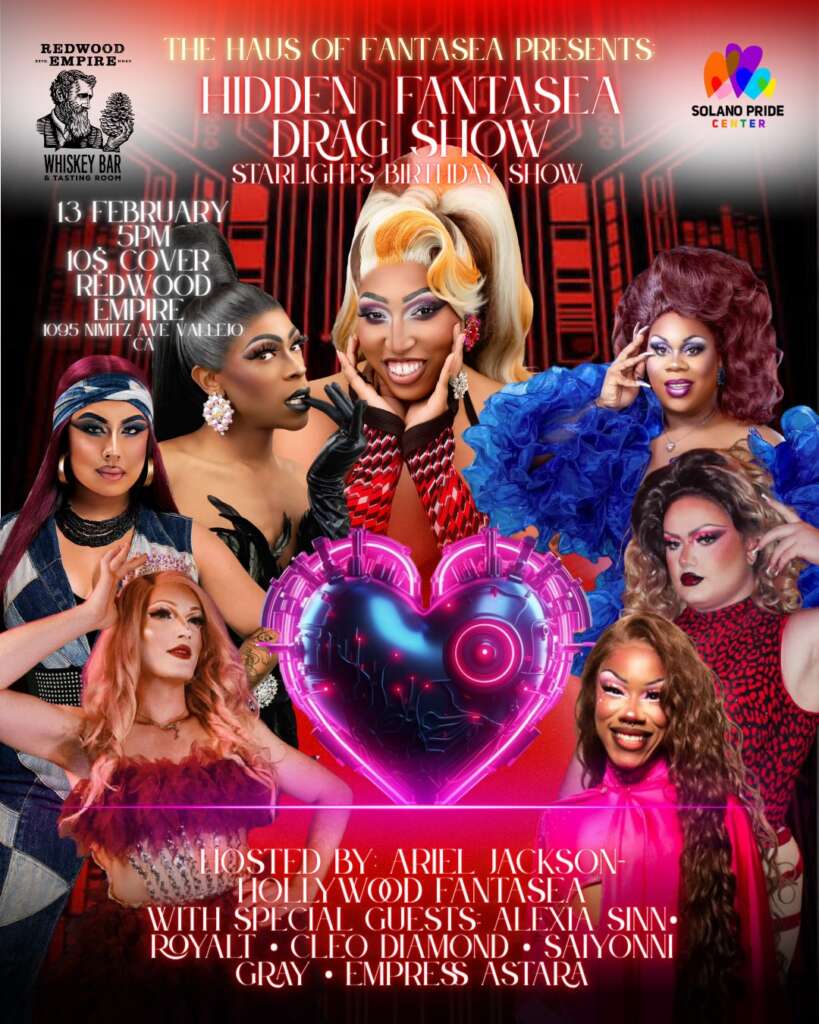 The Hidden Fantasea: Drag Show starts at 5PM on February 13th at the Redwood Empire Whiskey Bar (1195 Nimitz Ave, Vallejo’s Mare Island) so don’t miss it!