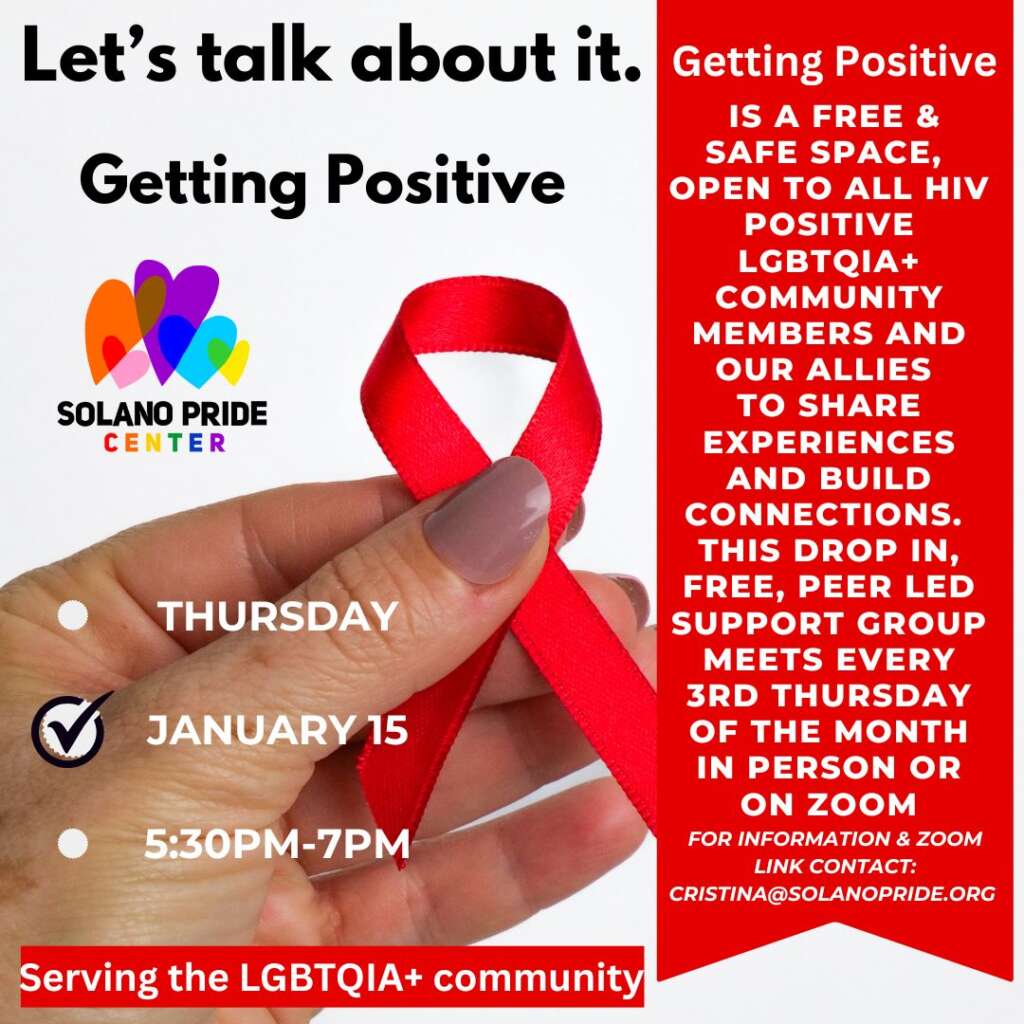 | The HIV Positive Support Group will continue as a zoom group on the 3rd Thursdays of the month, but now from 4:00 to 5:30 pm. The next group meeting is Thursday, November 19th. Contact cristina@solanopride.org for more information. This is the first meeting, so plan on attending to share what you’d like to see in future meetings! Facilitated by Cristina Zaldana. Future dates below. |