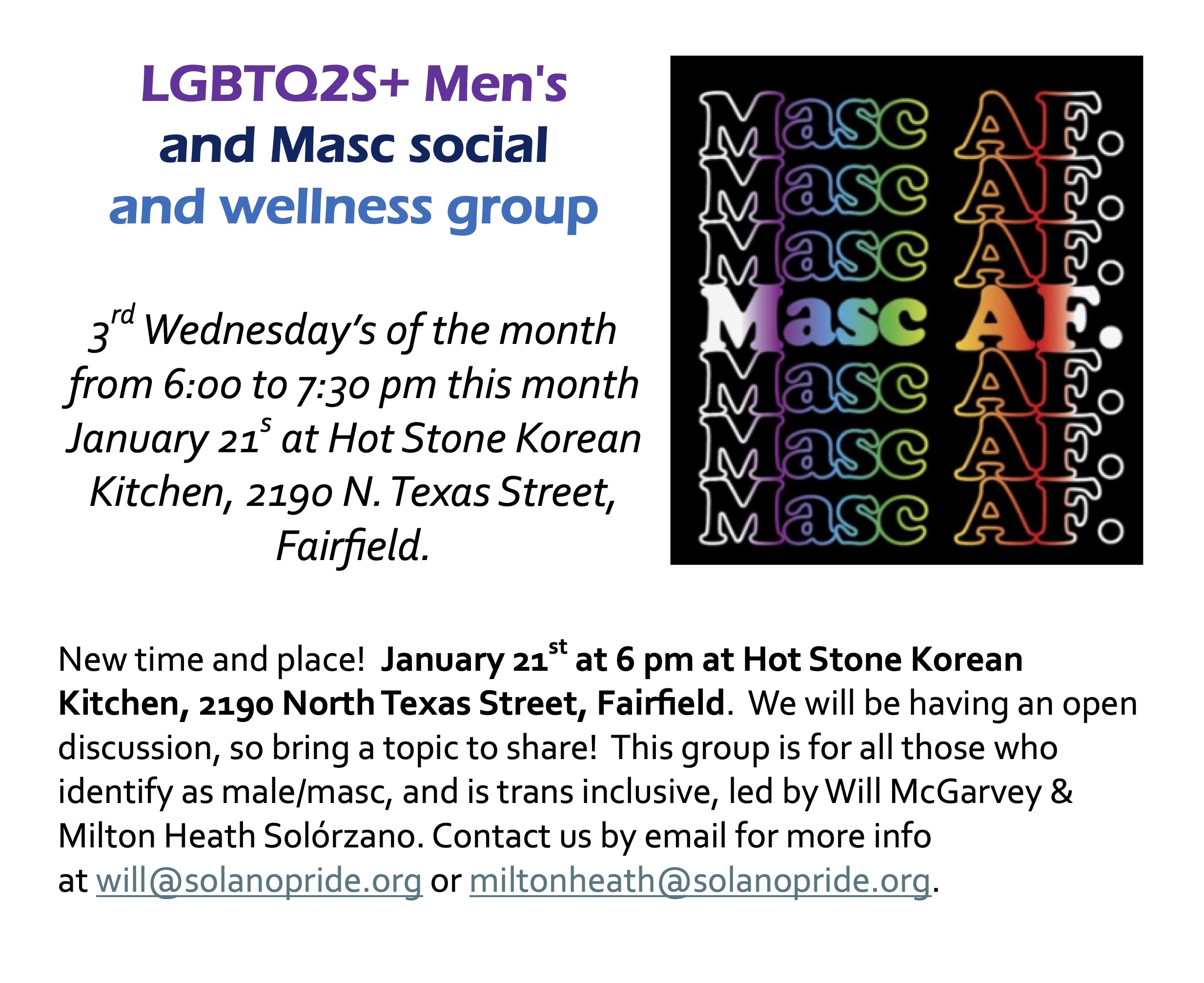 | LGBTQ2S+ Men’s & Masc Social & Support Group on the 3rd Wednesdays – New time and place! January 21st from 6:00 to 7:30 pm – we will meet at Hot Stone Korean Kitchen for dinner and conversation. Let Will or Milton know where you’d like to meet there. This group is for all those who identify as male/masc, and is trans inclusive, led by Will McGarvey & Milton Heath Solórzano. Contact us by email for more info at will@solanopride.org or miltonheath@solanopride.org. |