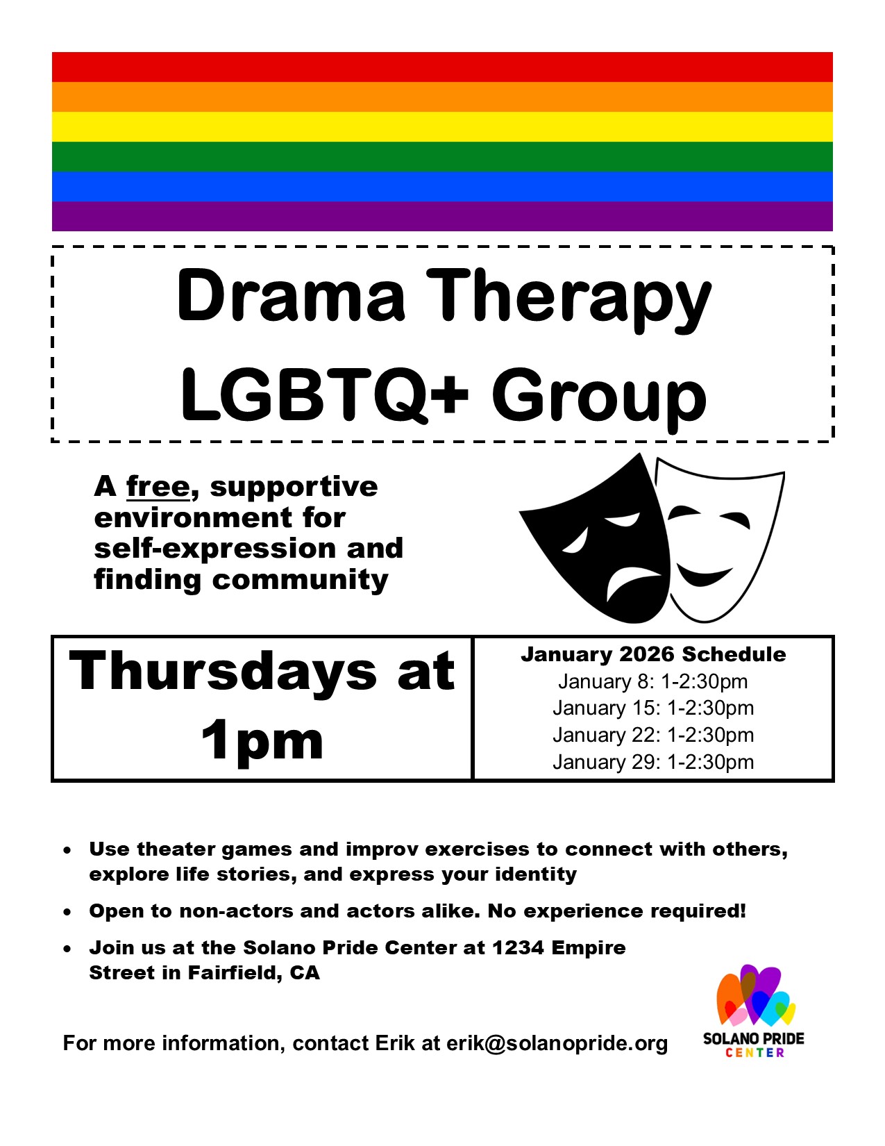 | Continuing at a new time on Thursday, January 8th, 2025 at 1:00 to 2:30pm. LGBTQ+ Drama Therapy Group. A free, supportive environment for self-expression and building community. If you are interested in joining a group at another time, reach out to Erik Thurman, the group’s leader. What is Drama Therapy? Drama Therapy is a chance to connect with others and explore emotions, identity, and social interactions through the use of theatrical techniques. Who can participate? This group is designed for the LGBTQ+ community. It is open to actors and non-actors alike. No prior theater experience is required. When and where is the group? We will meet at the Solano Pride Center conference room at 1234 Empire Street in Fairfield, now on Thursday afternoons beginning Jan. 8th at 1 pm. How can I get more information? Please reach out to Erik at erik@solanopride.org |