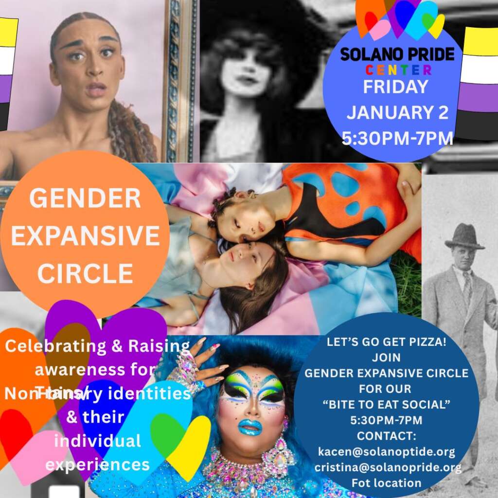 | The Gender Expansive Circle will meet again on Fridays, January 2nd at 5:30 pm at a nearby pizza restaurant for a Social Night. Next meets January 16th. GEC meets on the first and third Friday’s of each month unless noted.This group is for Trans, Intersex, Non-binary, Gender non-conforming and those questioning their gender identity or expression. The group will be led by Kacen Cosmos and Cristina Zaldana! Questions can be directed to Cristina Zaldana at cristina@solanopride.org. |