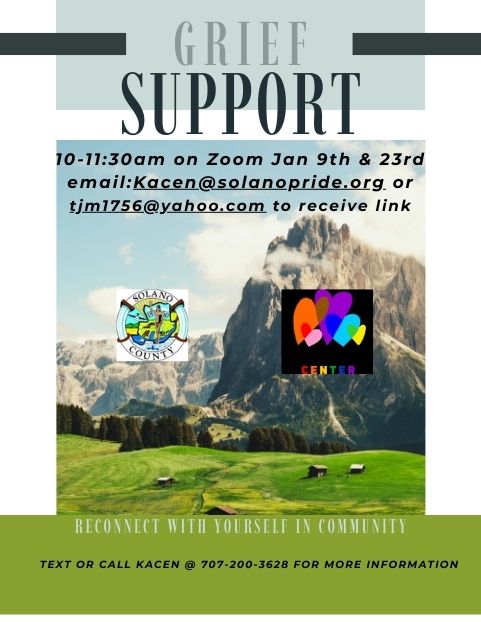 | Grief has no set boundaries. Grief comes in many different avenues such as losing a spouse, parents, a sibling, your pet, the loss of a friend or a friendship, even the loss of a job can cause us to grieve. This new group will begin Friday, January 9th from 10 – 11:30 am on zoom. The ne The way in which we cope with the loss is the way in which we begin to heal and move forward with our lives no matter the depth of pain and sorrow we are in. One way and there are many depending on how one copes with the loss is to talk about what we are feeling, what we are going through and share those feelings and thoughts with others who may be experiencing the same just as you are. The grief counseling session is an avenue for people to continue their healing process. More info, including the zoom link, at Kacen@solanopride.org or Tim Meyers at tjm1756@yahoo.com. |