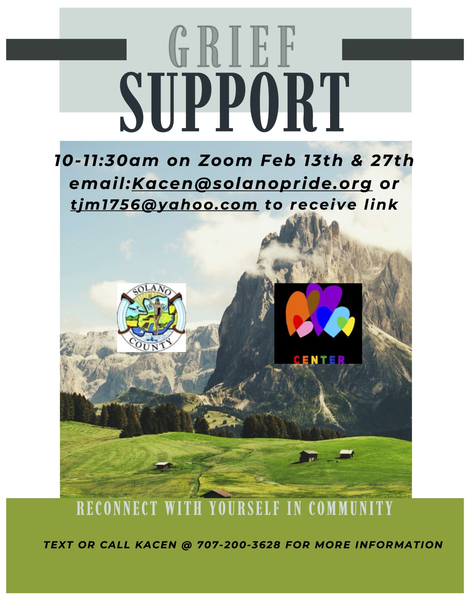 | Coping with Loss and Grief . Grief has no set boundaries. Grief comes in many different avenues such as losing a spouse, parents, a sibling, your pet, the loss of a friend or a friendship, even the loss of a job can cause us to grieve. This new group will continue Friday, Feb. 13th from 10 – 11:30 am on zoom. The next gathering would be Feb. 27th, also online. The way in which we cope with the loss is the way in which we begin to heal and move forward with our lives no matter the depth of pain and sorrow we are in. One way and there are many depending on how one copes with the loss is to talk about what we are feeling, what we are going through and share those feelings and thoughts with others who may be experiencing the same just as you are. The grief counseling session is an avenue for people to continue their healing process. More info, including the zoom link, at Kacen@solanopride.org or Tim Meyers at tjm1756@yahoo.com. |