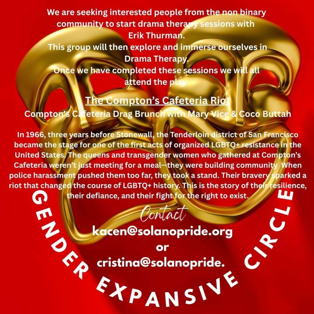 | The Gender Expansive Circle will meet again on Fridays, February 6th. GEC meets on the first and third Friday’s of each month unless noted.This group is for Trans, Intersex, Non-binary, Gender non-conforming and those questioning their gender identity or expression. The group will be led by Kacen Cosmos and Cristina Zaldana! Questions can be directed to Cristina Zaldana at cristina@solanopride.org. Also, seeking Gender Non-Conforming folx for a special Drama Therapy group, that would then go see The Compton Cafeteria Riot play in San Francisco. |