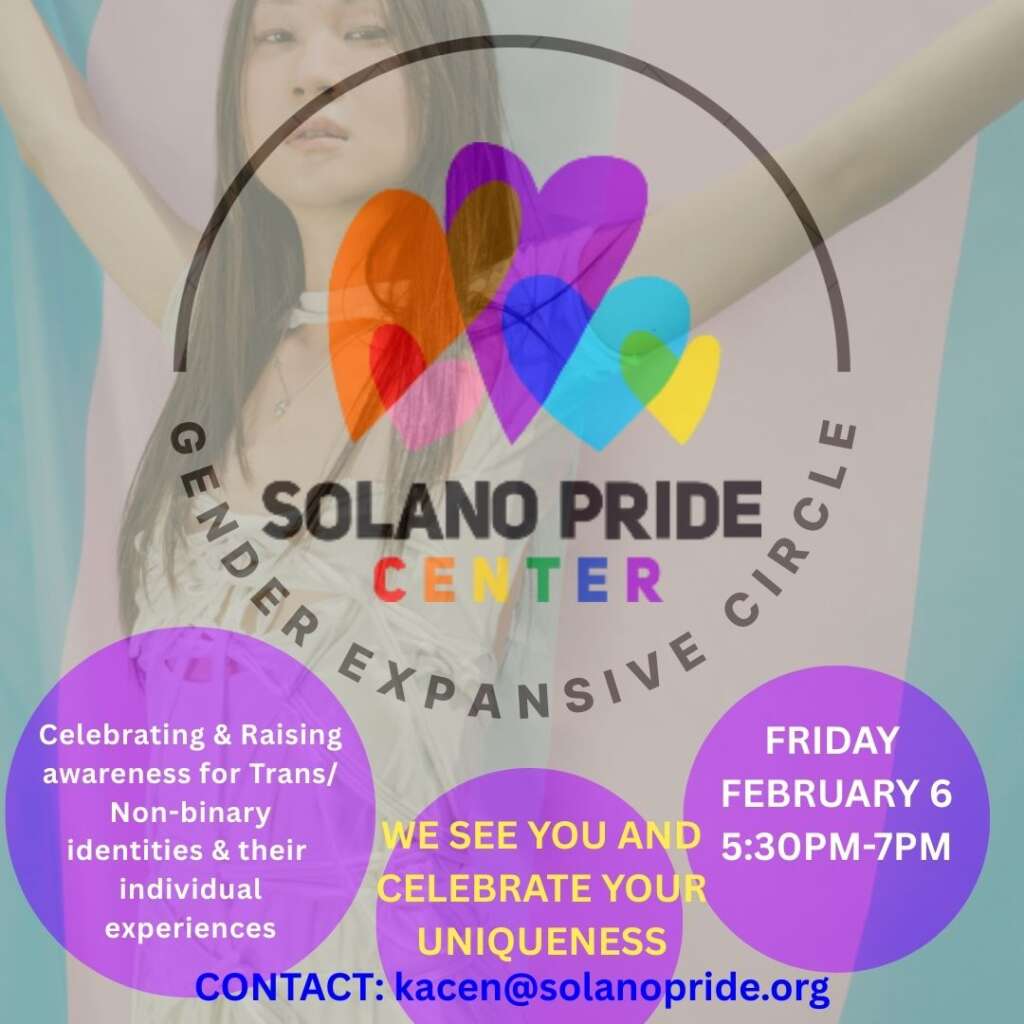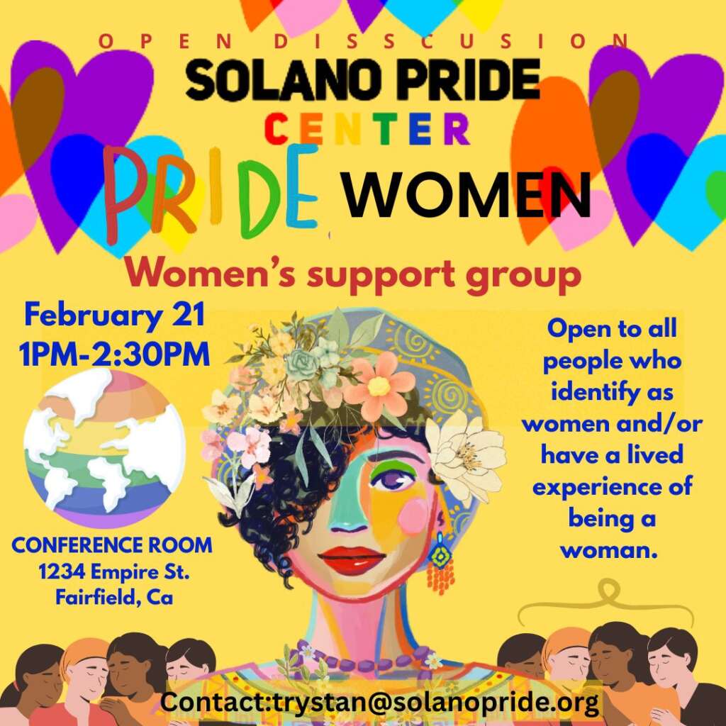 | New Trans inclusive Group for Women! Come to the inaugural meeting of Pride Women: the Center’s women’s support group for all who identify as women or have lived experience as a woman. Saturday, February 21st from 1-2:30 pm in the Conference Room (knock on the front door). Contact Trystan@solanopride.org for more information. |