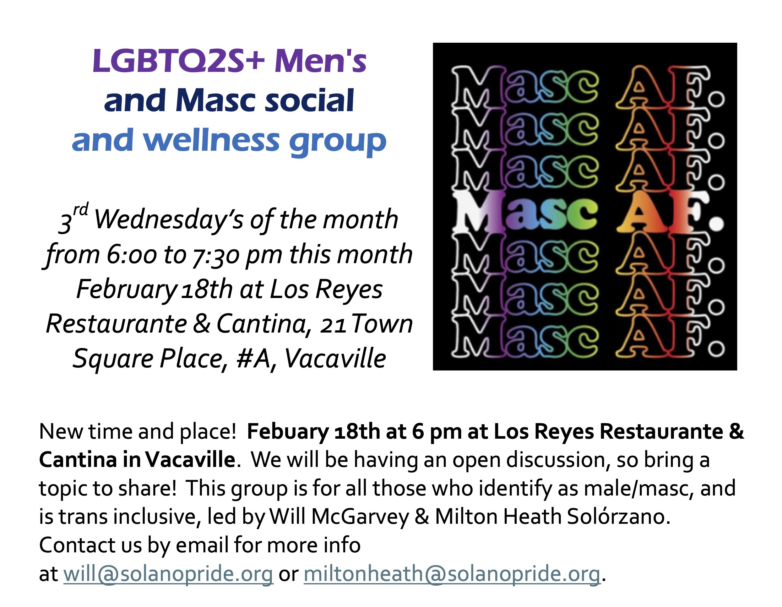 | LGBTQ2S+ Men’s & Masc Social & Support Group on the 3rd Wednesdays – New time and place! 3rd Wednesday’s of the month from 6:00 to 7:30 pm this month February18th at Los Reyes Restaurante & Cantina, 21 Town Square Place, #A, Vacaville New time and place! February 18th at 6 pm at Los Reyes Restaurante & Cantina in Vacaville. Let Will or Milton know where you’d like to meet there. This group is for all those who identify as male/masc, and is trans inclusive, led by Will McGarvey & Milton Heath Solórzano. Contact us by email for more info at will@solanopride.org or miltonheath@solanopride.org. |