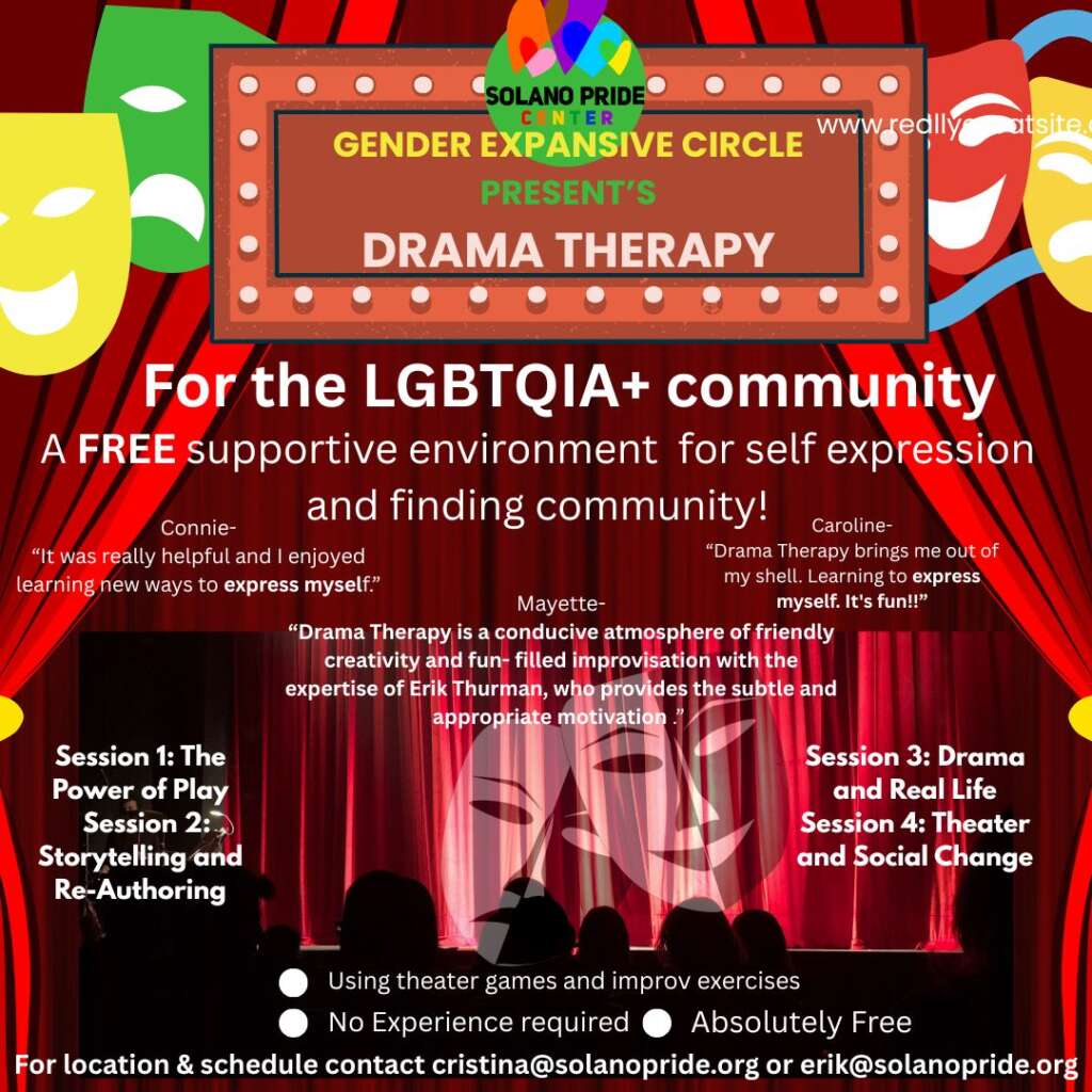 | Continuing at a new time on Thursday, February 26th, 2025 at 1:00 to 2:30pm. LGBTQ+ Drama Therapy Group. A free, supportive environment for self-expression and building community. If you are interested in joining a group at another time, reach out to Erik Thurman, the group’s leader. What is Drama Therapy? Drama Therapy is a chance to connect with others and explore emotions, identity, and social interactions through the use of theatrical techniques. Who can participate? This group is designed for the LGBTQ+ community. It is open to actors and non-actors alike. No prior theater experience is required. When and where is the group? We will meet at the Solano Pride Center conference room at 1234 Empire Street in Fairfield, now on Thursday afternoons beginning Jan. 8th at 1 pm. How can I get more information? Please reach out to Erik at erik@solanopride.org |
