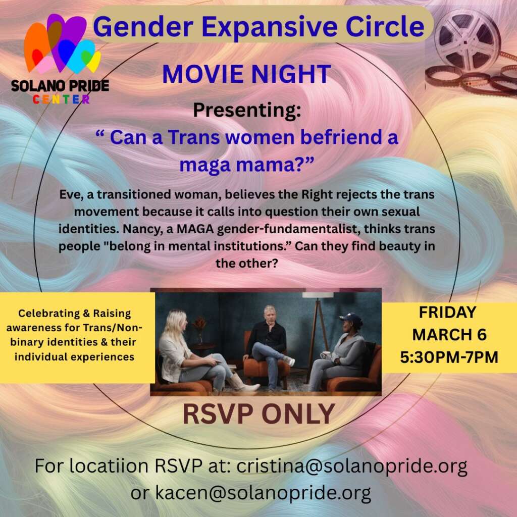 | New Trans inclusive Group for Women! Come to the meeting of Pride Women: the Center’s women’s support group for all who identify as women or have lived experience as a woman. Saturday, March 21st from 1-2:30 pm in the Conference Room (knock on the front door). Contact Trystan@solanopride.org for more information. |