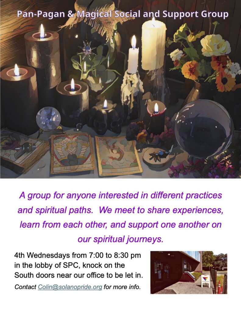 | Pan-Pagan/Magickal Support Group is normally the 4th Wednesdays from 7-8:30 pm, and will next meet in person at 7:00 pm on Wednesday, February 25th for a social night at the Center’s Lobby, please knock on the the south doors. This group is for those with any form of neo-pagan, polytheistic, or non-abrahamic practice, to explore the intersections of queerness and pagan spirituality. Led by members of SPC Staff. Bring something from your altar to share about. Email will@solanopride.org for more info! |