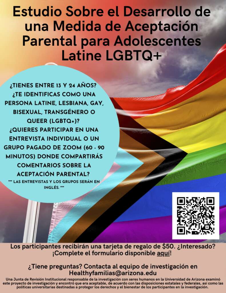 We are researchers from the University of Arizona, University of Florida, University of Miami, and University of Tennessee conducting a research study on developing a measure of parental acceptance for Latinx lesbian, gay, bisexual, transgender, and queer (LGBTQ)+ youth. We are e-mailing to ask if you would be willing to share this study and the attached flyer with Latinx LGBTQ+ youth who might be interested in participating.
