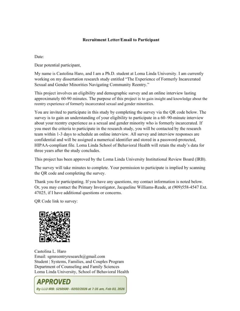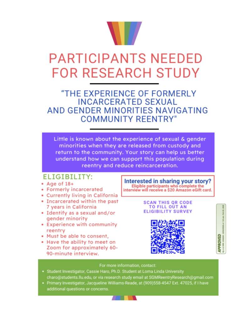 Cassie Haro, and I am currently a Ph.D. student at Loma Linda University. I am conducting research for my dissertation on the experience of formerly incarcerated sexual and gender minorities navigating community reentry, and I am seeking participants who would be interested in sharing their reentry story.