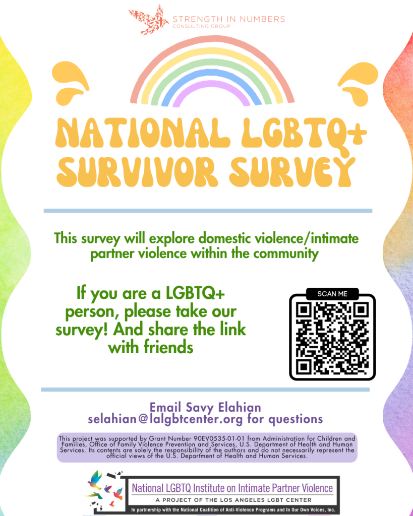 The National LBTQ Institute on Intimate Partner Violence (a project of the Los Angeles LGBT Center) is working with Strength in Numbers Consulting Group to understand LGBTQ+ survivors of intimate partner violence and their experiences with service providers and CenterLink is helping to get the word out. They are aiming to be thelargest study by and for LGBTQ+ survivors and many LGBTQ+ centers across the country sharing with their clients. The survey is out now! Please share it with your network. I’ve attached a flyer, and you can access additional outreach materials HERE. We want as many LGBTQ+ people to take this survey as possible so we can have a comprehensive understanding of the field. https://lgbtqipvinstitute.org/national-lgbtq-ipv-survey/