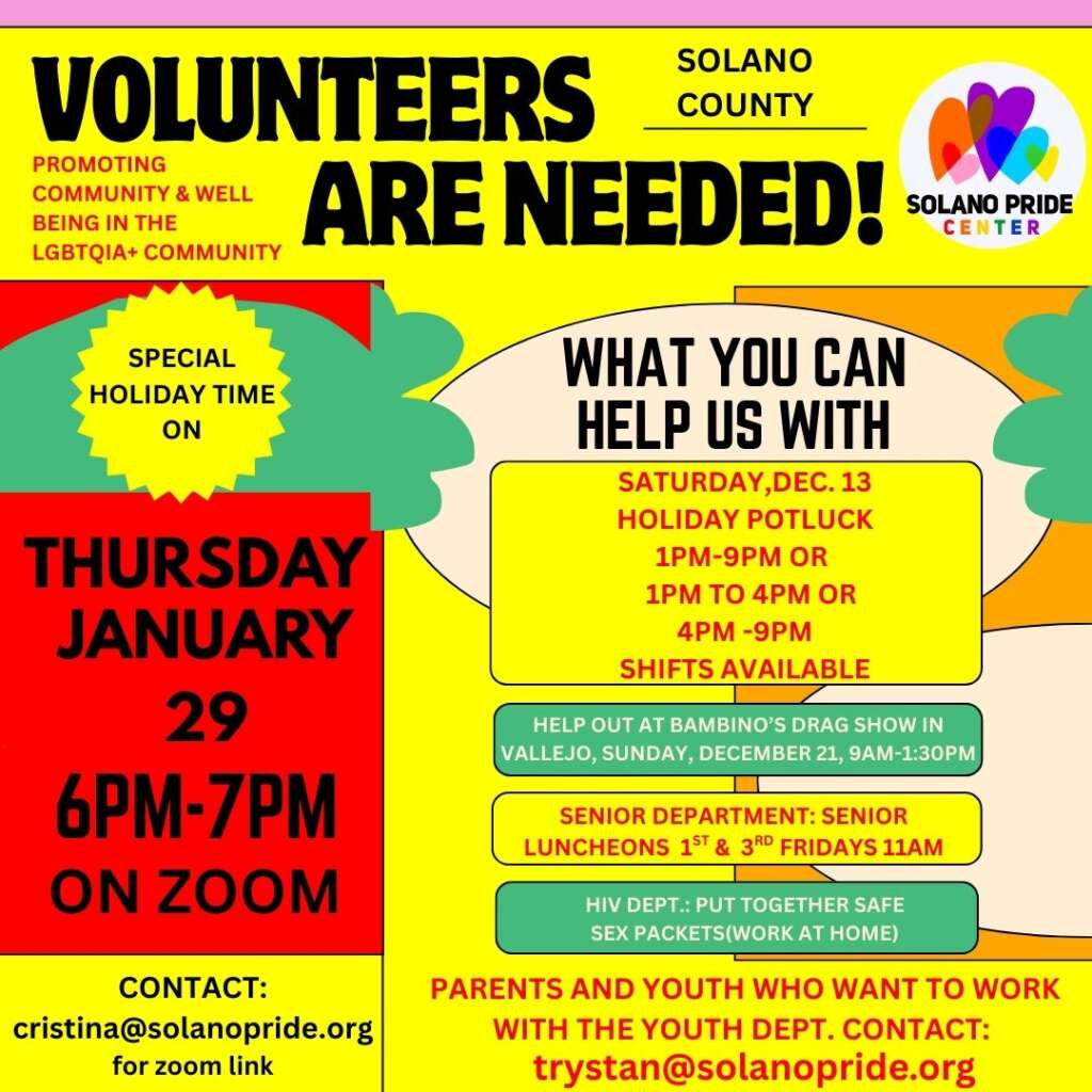 Our next Volunteer Training is scheduled for Thursday, January 29th at 6 pm on zoom. Parents and youth who want to work with the Youth Department, please contact trystan@solanopride.org. Upcoming opportunities: