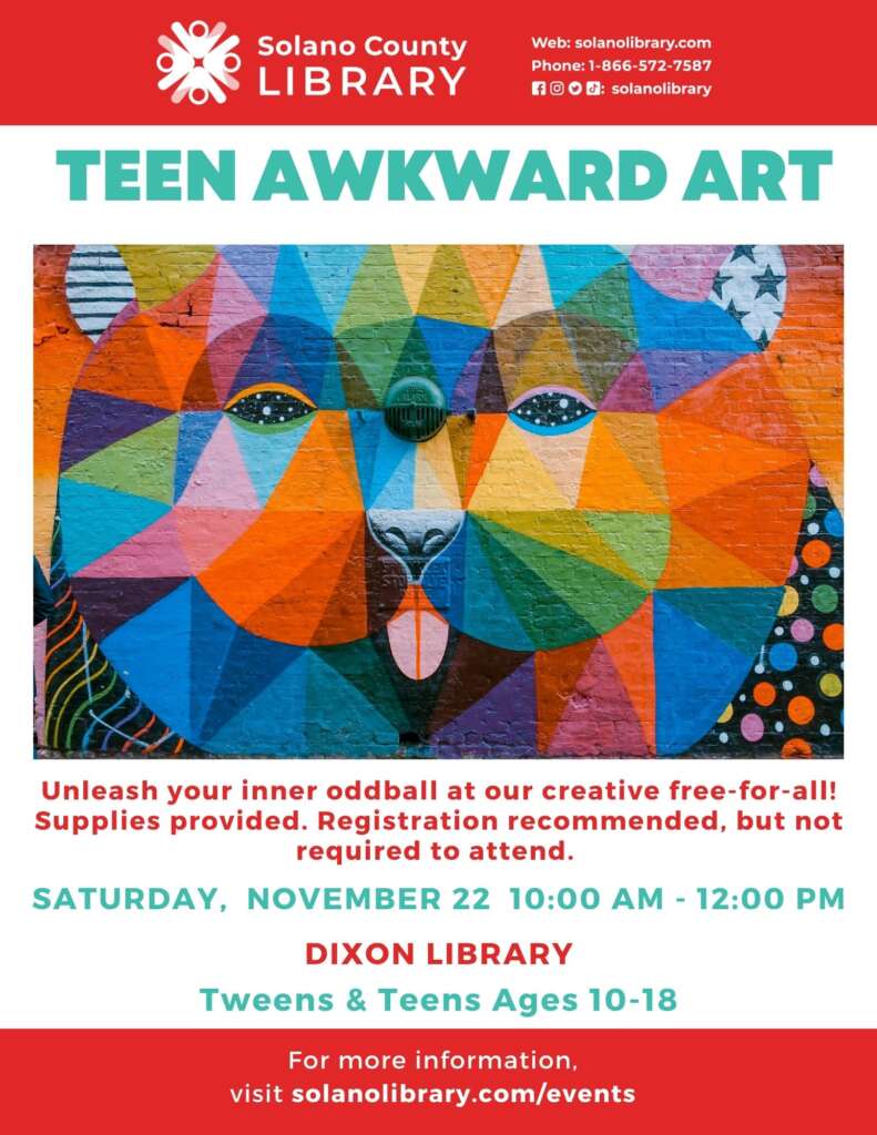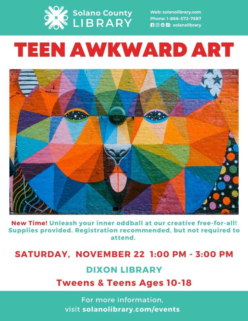 On Saturday, November 22nd we are having Teen Awkward Art from 10:00 am to 12:00 pm.