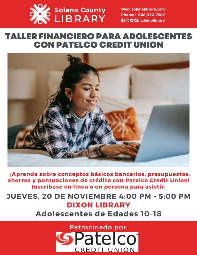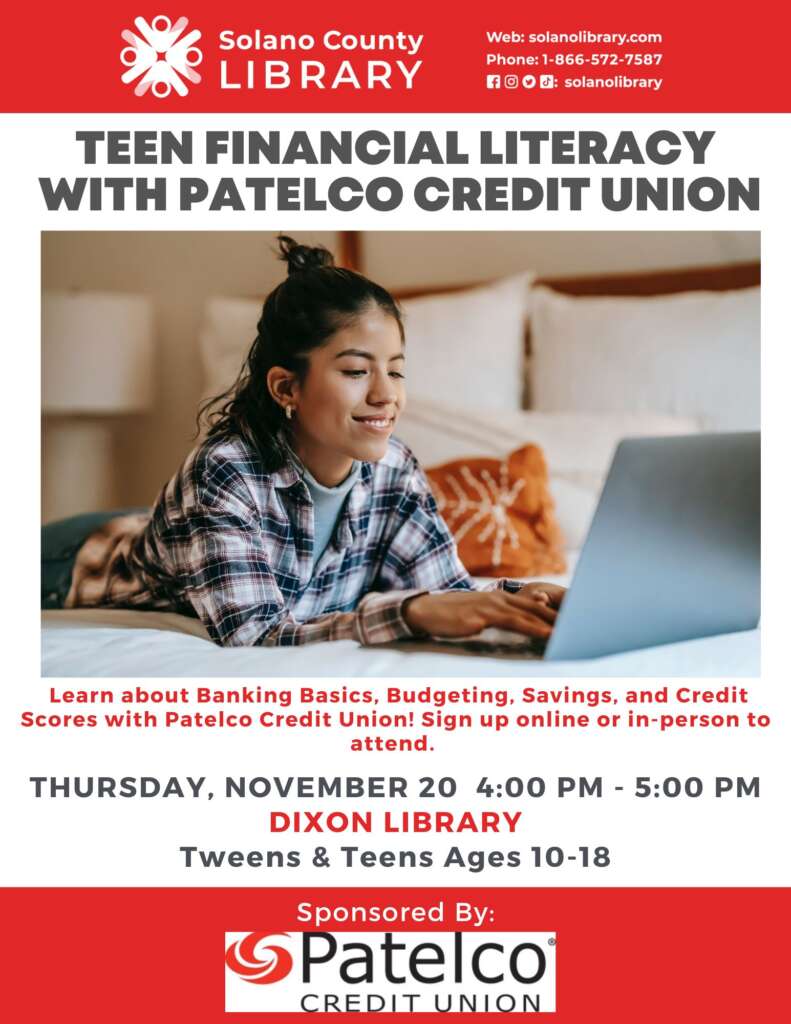 On Thursday, November 20th we are having Teen Financial Literacy with Patelco Credit Union from 4:00 pm to 5:00 pm.